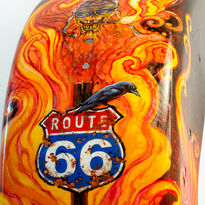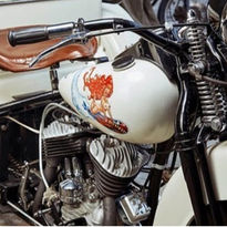 A motocicleta foi toda restaurada e customizada a partir da minha pintura da "Miss Torpedo". Fui convidado a pintar o tanque em acrílica com a mesma pintura que eu havia feito anos antes e que hoje está no acervo da Jurassic Machine.